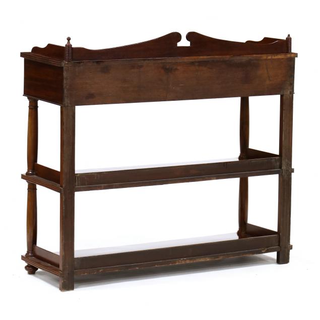 Late 19th century, mahogany veneer, oak secondary, rectangular form with applied backsplash above two side-by-side drawers above two lower shelves with turned column supports and gallery edge to each shelf.