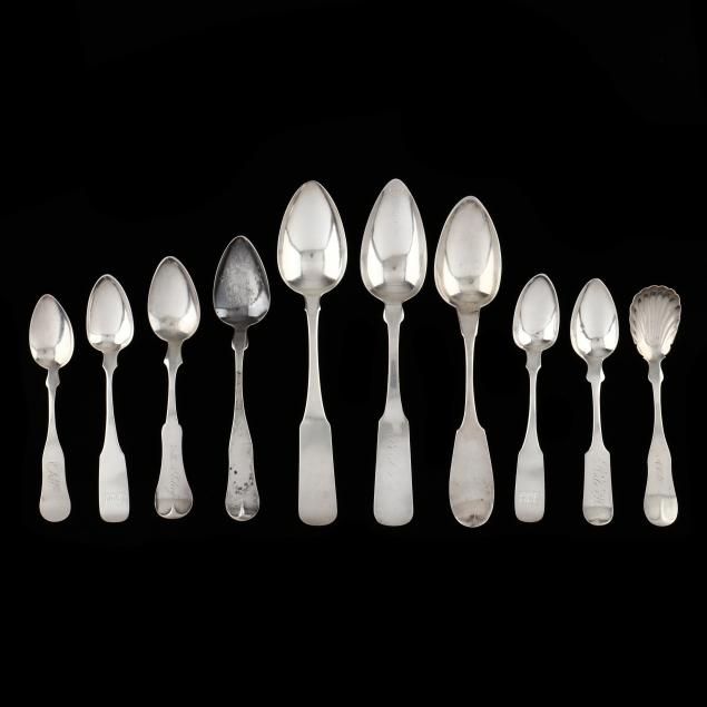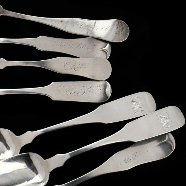 To include: tablespoon with mark of N. Matson & Co., and three part mark of Joseph Seymour & Co.; tablespoon with mark of L Goddard & Son, Massachusetts; tablespoon with rubbed mark; shell teaspoon with mark of N. Harding & Co., Massachusetts; teaspoon with mark of J. M. Crooker, Maine; teaspoon with mark of S. Melick, New York; (2) teaspoons with mark of Issac Reed & Son, Philadelphia; teaspoon with mark of Russell; teaspoon with mark of G. Spence, New Jersey. All pieces with various monograms.