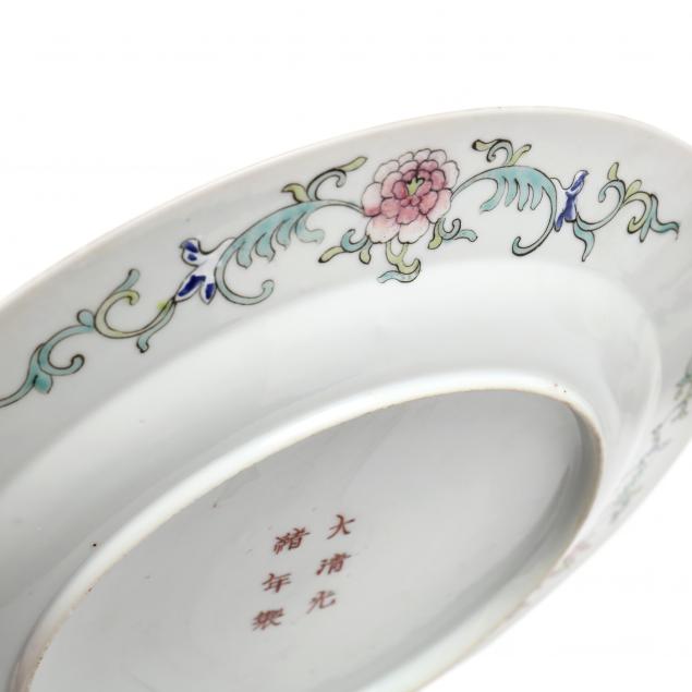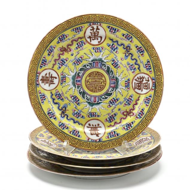 19th century, includes four plates, decorated in famille rose enamels and gilt highlights on a yellow ground with four round medallions each containing one of the four characters “wan shou fu jiang” (wishes for a long life without end) amidst swirling clouds, in the of the plates is a longevity "shou" symbol encircled by waves and mountains peaks symbolizing the cosmos, key motif around the rim, exterior sides with floral and vine decoration, six character Guangxu mark in iron red to underside of each.