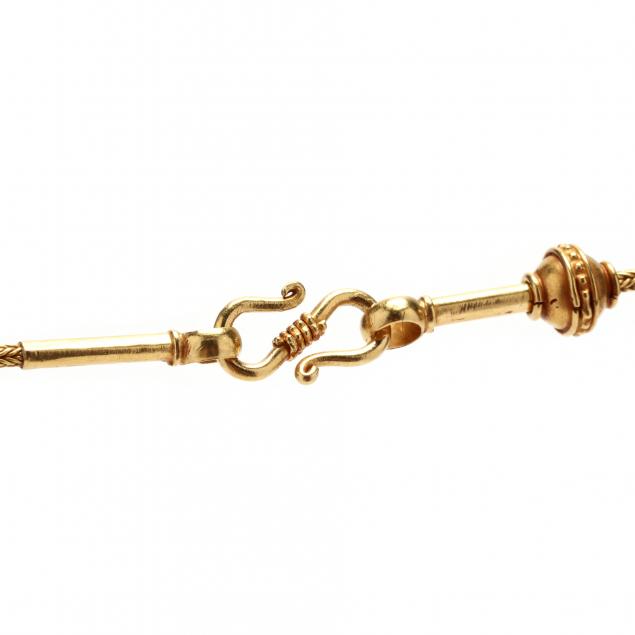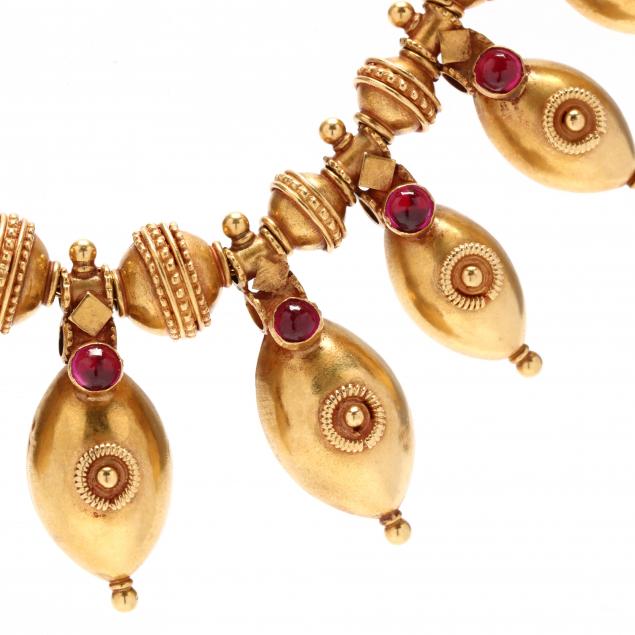 The woven gold chain with graduated and shaped gold drops with bezel set red cabochons (likely glass) alternating with decorated gold spacer beads, completed with a hook and eye clasp, testing 18KT.