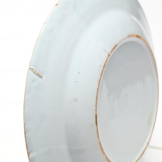 18th century, to include: a four color plate of a floral basket, the border alternating blossoms with diaper panels, probably Bristol (11 5/8 in.) (some edge fritting); a small plate floral decorated (8 7/8 in.) and a footed center bowl, probably Liverpool, the exterior painted in a chinoiserie design, the interior with blue border and center decoration (4 1/4 x 10 1/2 in.) (edge chips; multiple breaks and repairs).
