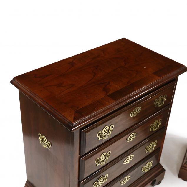 Late 20th century, mahogany veneer, top with banded edge, four drawers with molded edge, sides with bail handles, shaped bracket feet, labeled.