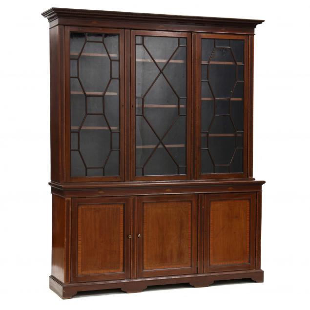 Circa 1900, three part form, mahogany and mixed wood veneers, pine secondary, cove molded cornice with shell and line inlaid frieze, upper case with three hinged astragal molded doors, louvered shelf interior, waist with repeating shell and line inlaid frieze over three hinged cabinet doors, divided and shelved interior, shaped bracket feet, the whole with all over banded inlays.