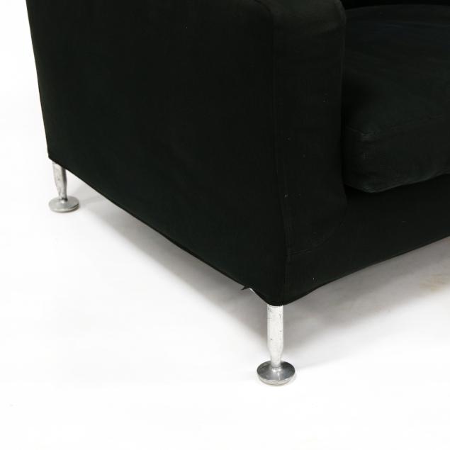B&B Italia, black velcro upholstery, loose back and seat cushion, aluminum legs with pivot disc feet, labeled.