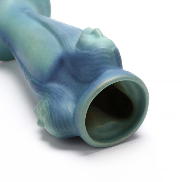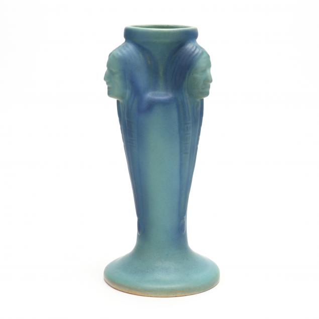 First half 20th century, tapered form in "Ming blue" glaze, with three Indian heads in varied expressions, each with two long braids extending to a circular foot, incised logo mark with “AA VAN BRIGGLE / COLO. SPGS.” to underside.