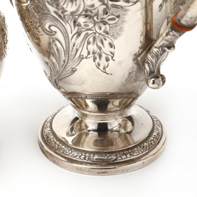 Four piece set, all pattern number 7185, the body with floral repoussé and hand-chased designs around a vacant cartouche, foliate scroll handles over a round pedestal foot, to include: coffee pot (11 3/4 in.); teapot (10 1/2 in.); double handled covered sugar (8 1/4 in.); creamer (7 1/8 in.). All without monograms.