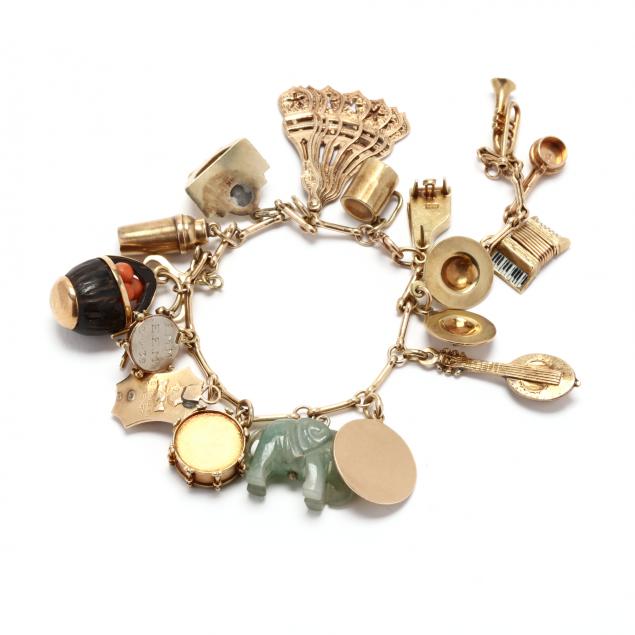 The gold bar and round link bracelet with (17) charms to include: a mug, testing 14KT; an articulated lady's fan, testing 14KT; a bar with bottles and stools, stamped 14K; a cocktail shaker, stamped 14K; ice tongs, stamped 14K; a carved coral basket of fruit; a drum with presentation engraving dated 3-4-39, testing 14KT (legs bent); an engraved medallion dated 12-13-27 and with enamel decoration and diamond accent, testing 14KT; an engraved snare drum dated 4-7-39, stamped 14K; a green hardstone carved elephant; a St. Christopher medallion, stamped 14K; a mandolin, testing 14KT; cymbals, stamped 14K, a grand piano with presentation engraving and date of 4-7-39, stamped 14K; accordion with spring movement, testing 14KT; a banjo, stamped 10K; and a trumpet, stamped 14K (horn bent); clasp stamped 14K.