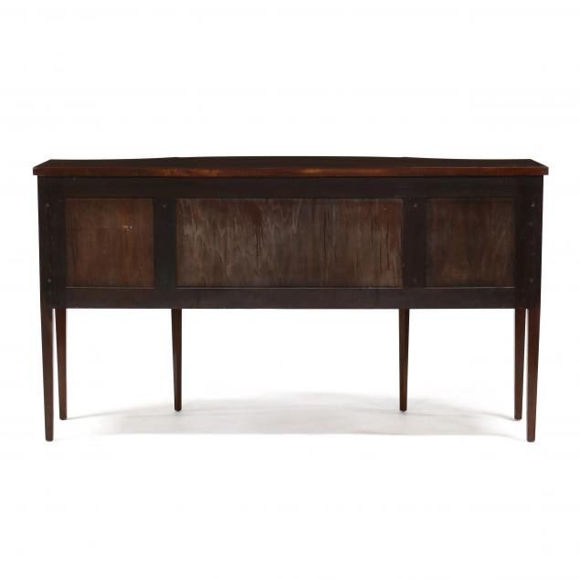 First half 20th century, mahogany veneer with light and dark wood inlays, serpentine form, banded top with edge inlay, central drawer over two hinged recessed convex doors with open interior, flanked by two drawers with divided interior over two hinged concave deep drawers, all with triple line and corner fan inlays, inlaid oval panel stiles, straight tapered legs with bellflower, line and cuff inlays, marked on locks, with one key.