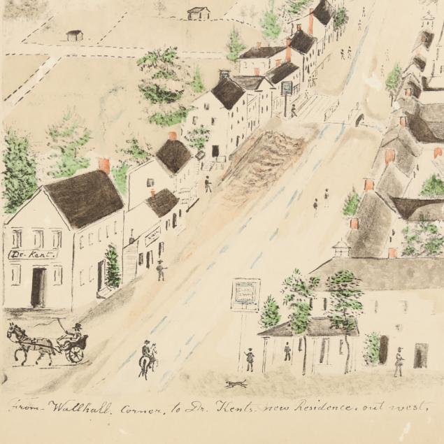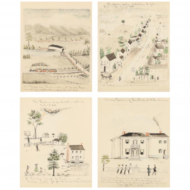 Hand-colored collotypes, early 20th century after earlier watercolors, to include images of "The Bridge Over Reed Creek," "The Western Portion of the Town," "The New Residence of the Reverend Charles A. Miller, Buil[d] 1856," and "The Residence of Mr. Crockett, in Wytheville, July 1 1856," in uniform gilt framing.