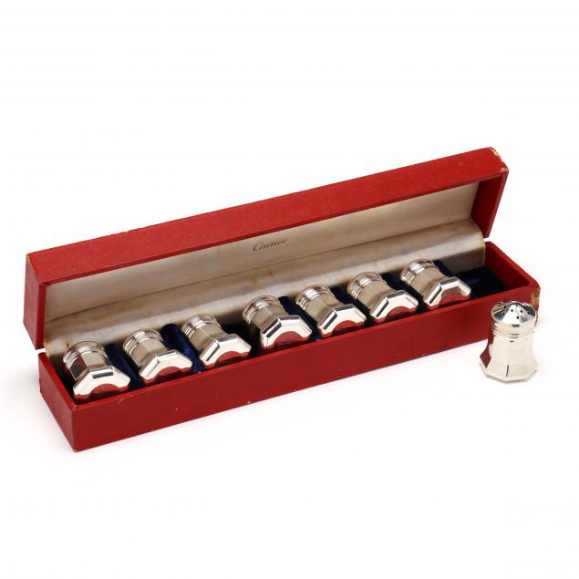 Presented in the original fitted red case, all shakers marked "Cartier / Sterling" to undersides, case marked to interior.