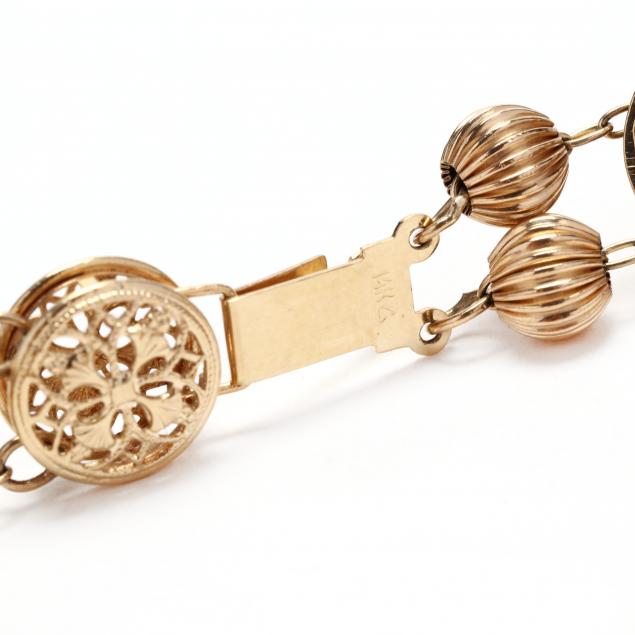 The double chain bracelet with bead spacers between the eleven slide charms set with various gemstones to include garnet, opal, amethyst, diamond, and more, with shell cameo to center, completed with a round filigree clasp, clasp stamped 14K, charms stamped 10K and with maker's mark OMG.
