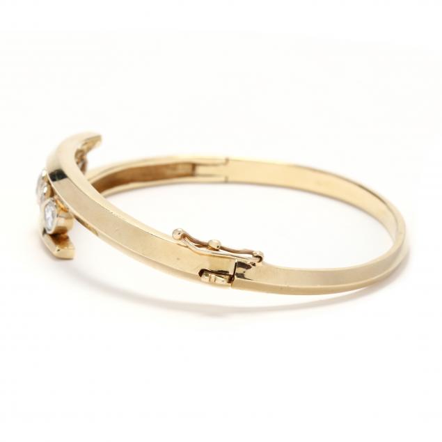 The hinged bangle bracelet in a bypass design set to the top center with five bezel set round transitional cut diamonds weighing approximately 2.16 total carats (H-J color, I2-I3 clarity) and completed with integrated clasp and figure eight safety, stamped 14KT.