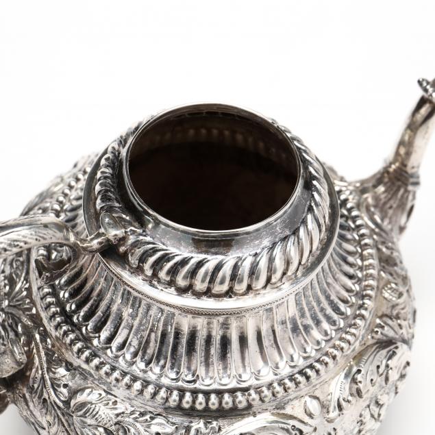 1838 date mark, unknown maker's mark, dolphin mark indicating local production and a fineness under the .833 purity standard; of squat circular form with boldly chased acanthus and floral designs flanking two figural vignettes, cast and applied handle with figural thumb guard, the spout terminating in an open mouthed bird mask, the removable domed cover with cast finial in the form of a cupid, raised on an applied conforming foot ring. No monograms.