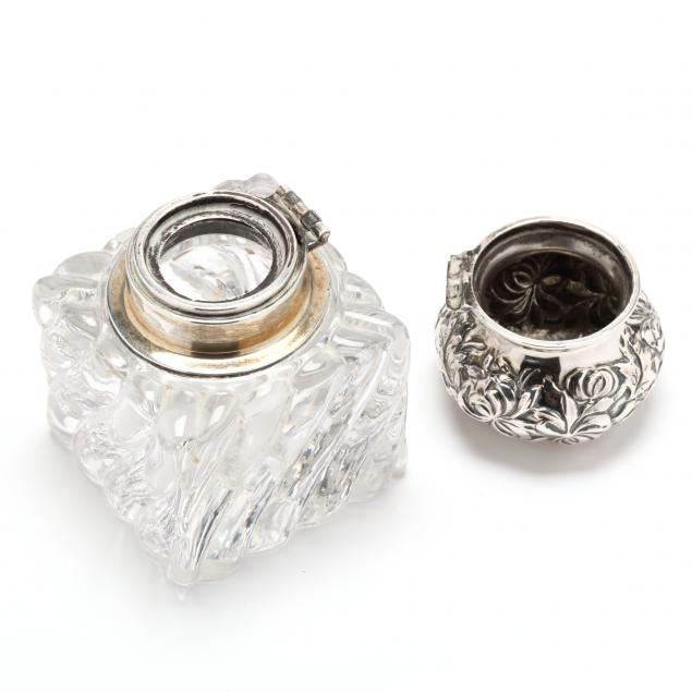 First a brandy warmer, marked "Sterling" with pattern number 808 to underside, no monogram (2 1/4 x 6 x 3 in.); second a George V oval vanity brush, 1916 date marks, RJH monogram; third a rectangular (1 3/4 x 2 x 7 in.); George W. Shiebler sterling silver lidded glass vanity jar, pattern number 32, repoussé foliate and floral designs to lid over a swirl cubic form jar, no monogram. (4 1/8 x 2 1/2 x 2 1/2 in.).