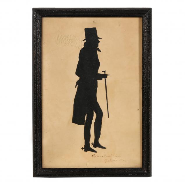 19th century, the full length silhouette profile of the Virginia statesman, in black tone paper, mounted upon cream paper with ink inscription to lower right "John Randolph / of Roanoke," presented behind glass in a black painted wood frame, appears unsigned.