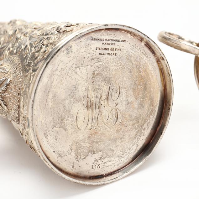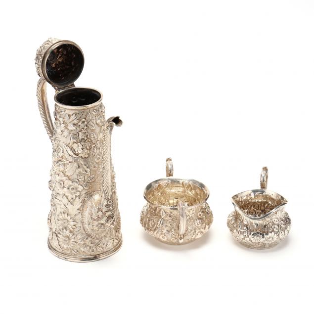 Mark of Jacobi & Jenkins, circa 1900, three pieces including a coffee pot of lighthouse form, sugar bowl and creamer; each hand-chased with effusive floral decoration against a stippled ground, cast and applied handles, period script monogram to underside "MG," pattern number 146.