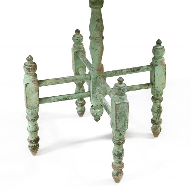 Possibly to Chatham County, early 20th century, yellow pine with green paint, circular one board top, square support rails, turned standard with four ring turned tall legs each with a double rounded stretcher.