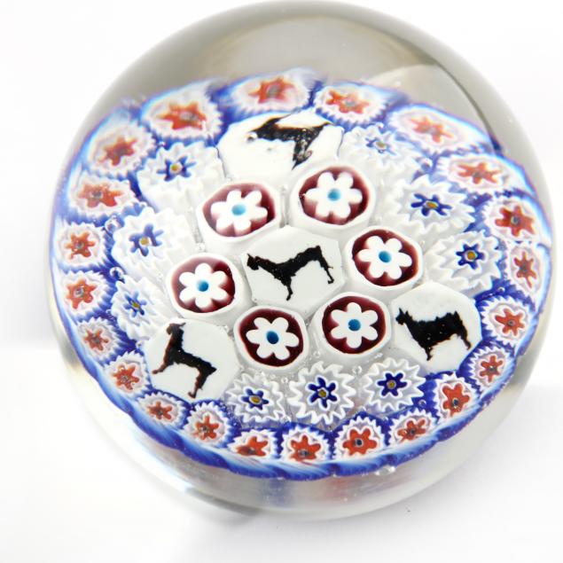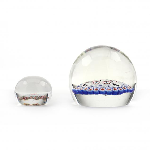 Including two iridescent hollow blown weights (one with illegible signature); one millefiori weight featuring dog canes; a miniature millefiori weight; a mixed cane weight; and a clear air trap weight signed Orrefors; together with two Sotheby's catalogs, hardback edition of Patricia McCawley's "Glass Paperweights"; hardback edition of Paul Hollister's "Glass Paperweight of the New-York Historical Society"; and a softcover edition of James Mackay's "Glass Paperweights".