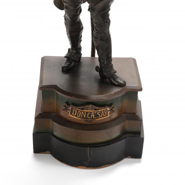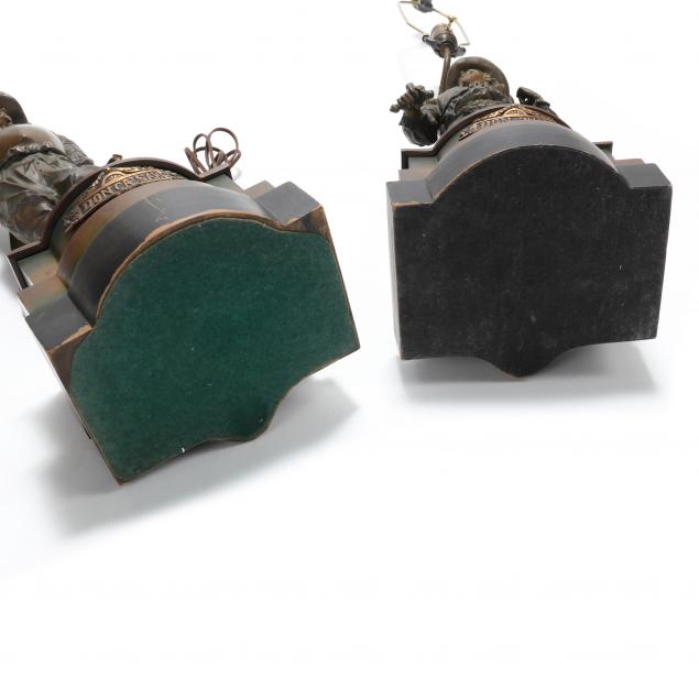 Circa 1940, bronze toned spelter figures mounted to ebonized wood bases with title plaques reading "Don Juan" and "Don Caesar", with vintage painted paper shades.