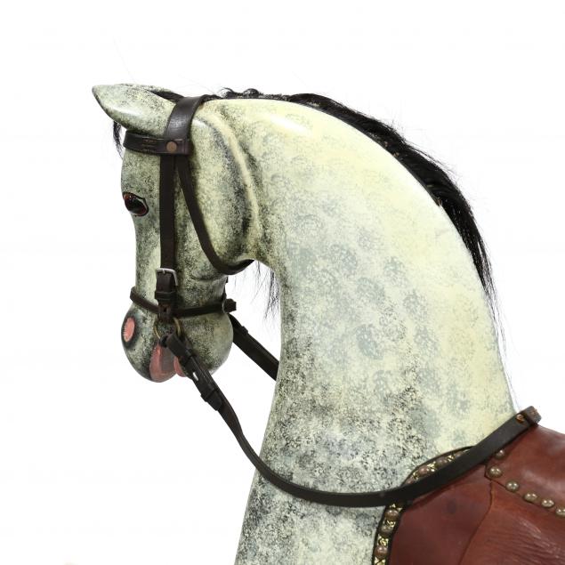 1991, hand carved and painted by Bryce & Debra Chase, wooden horse with leather saddle, glass eyes, horse hair mane and tail, oak platform, labeled to underside of belly.