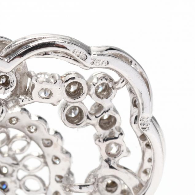 Designed in a flower motif with openwork and filigree detailing, set with full cut round diamonds weighing approximately 2.32 total carats (G-H color, SI-I clarity), completed with a single locking pin stem, stamped 18K 750 and with partial maker's mark.
