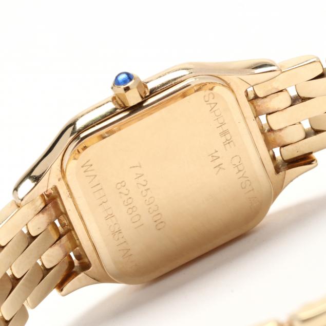 Quartz movement, the signed white dial with black Roman numeral hour markers and blued steel sword hands, completed with a gold bracelet band with deployment clasp marked K91 / Spain / 585, case reverse marked 14K / 74259300 / 82980.