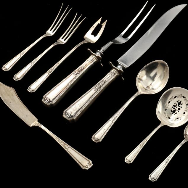 (40) pieces, including: (6) knives (8 5/8 in.); (6) forks (7 1/4 in.); (5) salad forks (6 1/4 in.); (9) teaspoons; sugar spoon; flat handle master butter spreader; pierced bon bon spoon; (2) lemon forks; pickle/olive fork; (6) demitasse spoons; (2) carving knife and fork. All with matching script monogram, except master butter and one lemon fork without monograms.