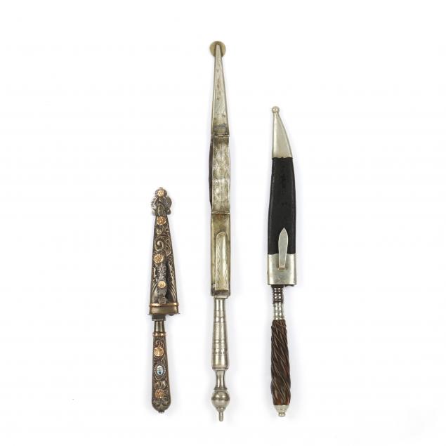 Variously late 19th and early 20th century, to include: La Movediza marked gaucho knife in an .800 fine silver sheath having gold alloy mounts and an enameled Argentine coat-of-arms (8-1/4 in., small discolored area on sheath, else very fine condition); the second knife unmarked, with silver alloy grip, 7-1/2 in. blade, leather sheath with German silver mounts (some discoloration to blade; overall wear; very good condition); German-made gaucho knife marked F. HERDER / ABR. SOHN / SOLINGEN, 6 in. blade, with horn handle, the leather sheath with German silver mounts (some stiffness to leather, overall very good condition).