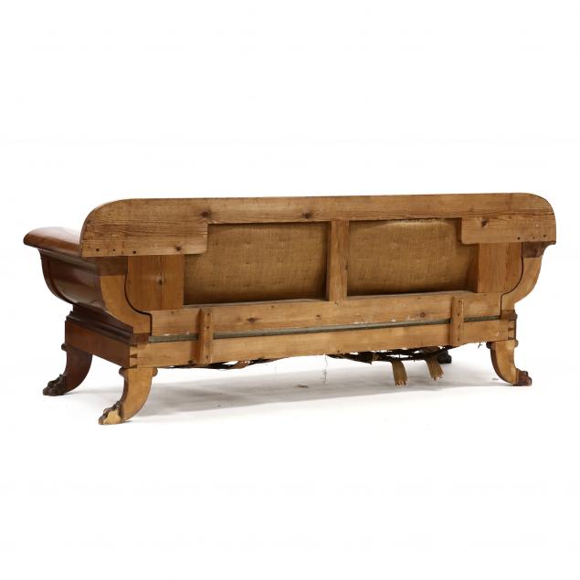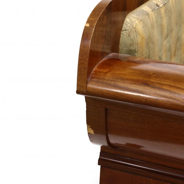 Circa 1820-40, mahogany veneer, pine secondary, vertically veneered and upholstered back, wide cornucopia formed arms with relief carved front panel, vertically veneered seat rail flanked by carved rosettes, four cornucopia legs with hairy paw feet, unfinished back.
