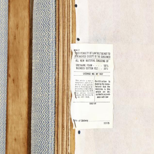 Second half 20th century, carved and off-white washed frame, light blue and golden yellow chevron upholstery, down-filled loose seat cushion.