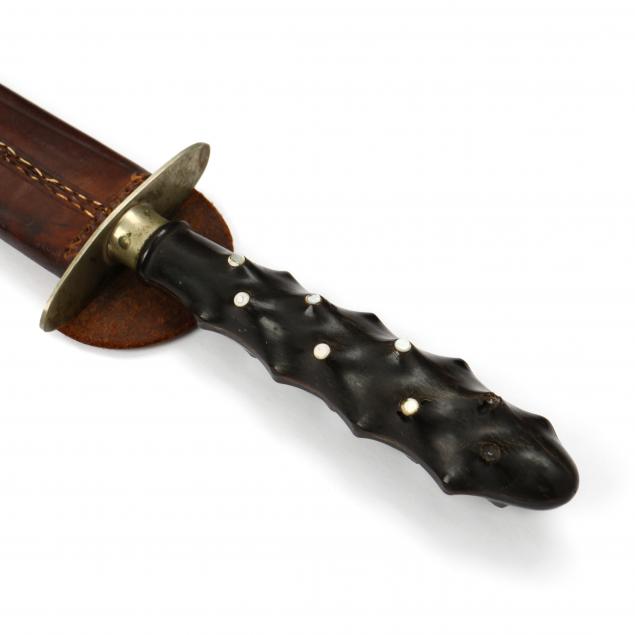 Wolverhampton, England, mid-19th century, maker's name on its 7 in. blade, three castle towers and a key on the ricasso, a German silver guard is below the horn grip that has mother-of-pearl inlays throughout; includes leather sheath.