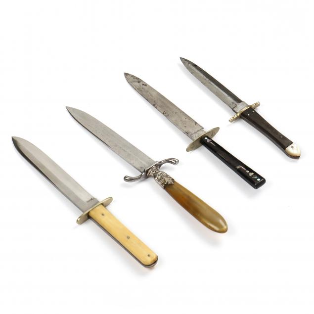 To include: Manhattan Cutlery Co., 4-7/8 in. blade, German silver cross guard, shell inlays to wooden grip; Rogers, 6-1/4 in. blade, German silver cross guard, lacquered grip with shell inlays; Venture Slater, 6-1/4 in. blade, German silver cross guard, bone handle; Alfred Williams, 6 in. blade, steel cross guard, horn handle.