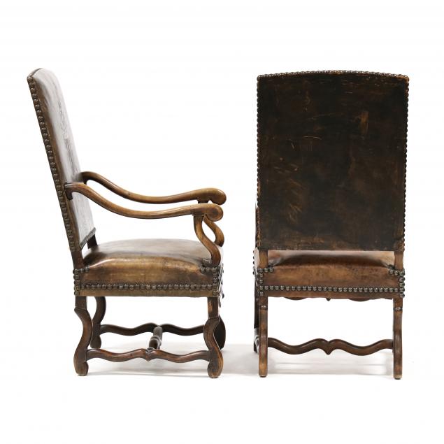 The leather with differing colorations from age; some insect damage; the lighter colored chair with some joint looseness.