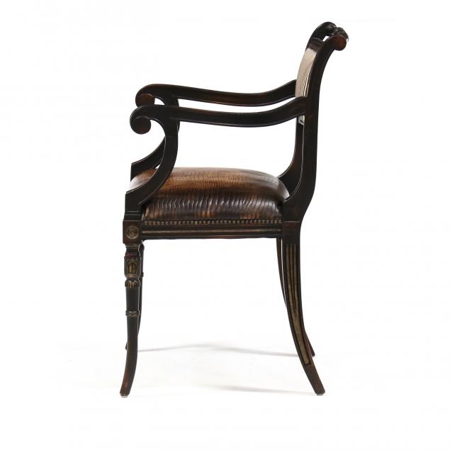 Late 20th century, antique black painted wood frame with gilt highlights, turned and carved crest rail, brown striped upholstered back, faux reptile skin upholstered seat with brass nail head trim, front turned and carved saber legs, labeled.