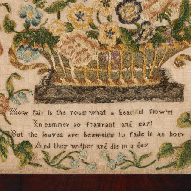 Worked in multi-color silk and chenille on loose linen ground centering on a large floral filled basket, field with floral sprays and fruit, with alphabet to top register surmounting maker's name and date, "Sarah Ralston Jones / ag'd 8 years April / 1822," bottom register with verse and alphabet to corners, presented under museum glass in a mahogany veneer frame with gild molding.