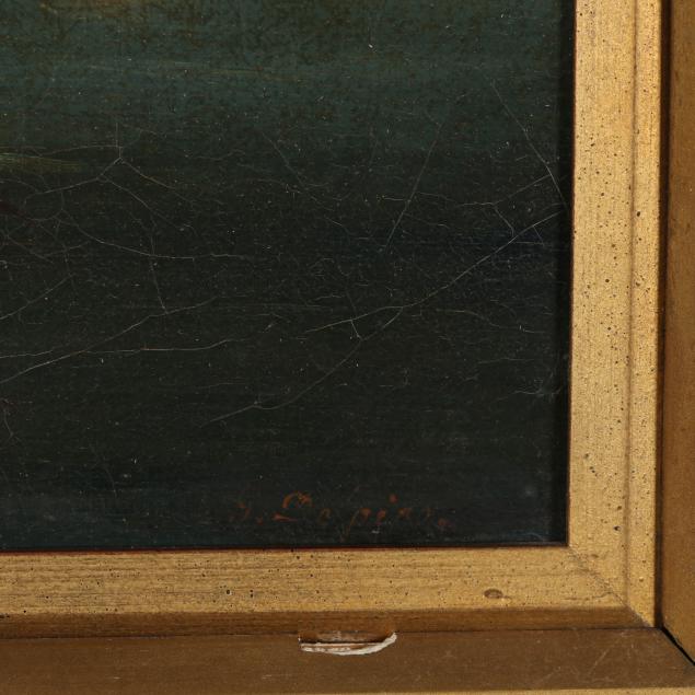 Oil on canvas laid on board, signed at lower right, presented in a later gilt composition frame.