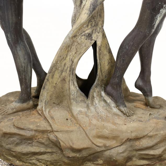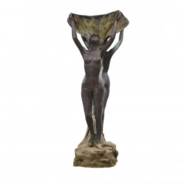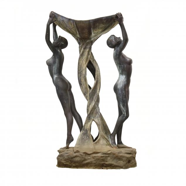 Contemporary, patinated cast bronze, appears unsigned, depicting two twin life size nude female figures in mirrored poses supporting a large bowl with pierced water helix center.