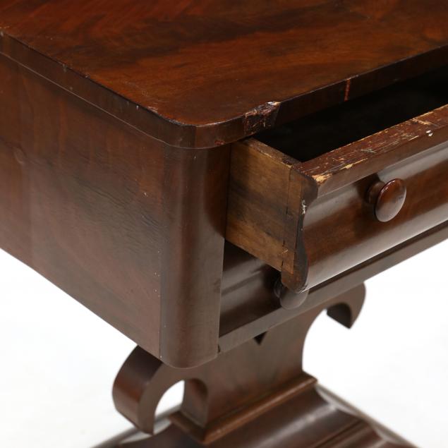 Circa 1840, mahogany veneer, white pine and poplar secondary, top with front rounded corners, two ogee drawers, scrolled support on a rectangular ogee base with ogee bracket feet on casters.