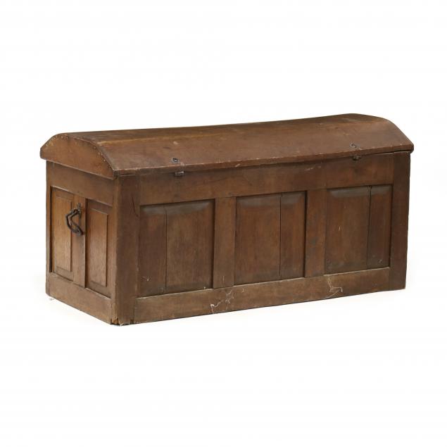 Likely German, circa 1800, mixed wood inlay, hinged dome lid with fish tail hinges, interior with till, front panel with inlay "Anno 1751 ACDL", flush base, paneled sides with wrought iron handles.