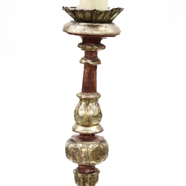 First half 20th century, carved wood with tin bobeche, silvered and gilt highlights over red wash, tripod base.