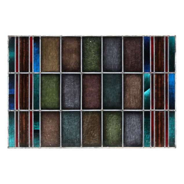Circa 1960, rectangular form with multi-color linear pattern having an antiqued painted surface on seeded glass, lead solder, unframed.