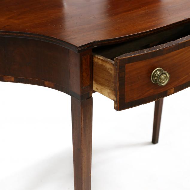 Early 19th century, mahogany and rosewood veneers, white pine secondary, diminutive form with a shaped top and bow-front front edge, central drawer featuring a rosewood banded veneer border, upper stile with inlaid satinwood panel, skirt bottom edge with banded and checkered line inlay, tall square tapered legs with light wood line inlay and inlaid lower cuff.
