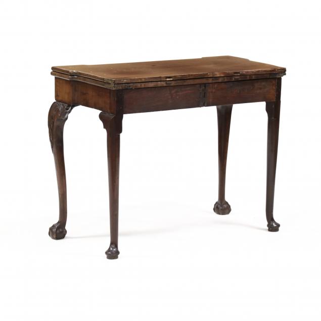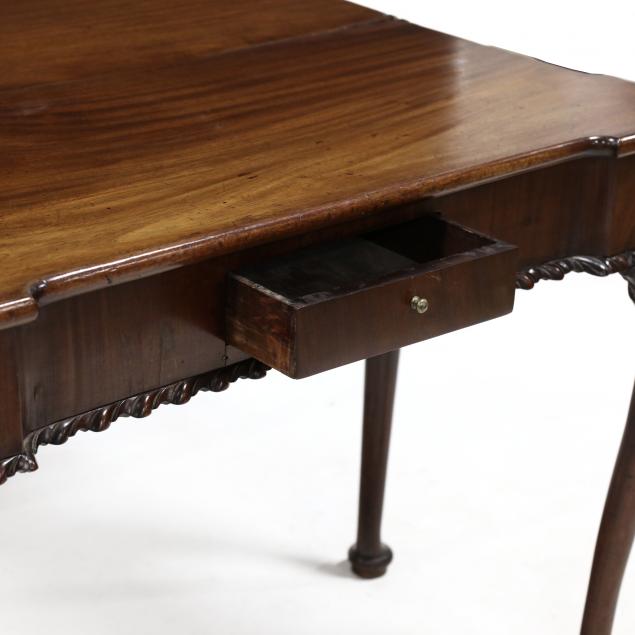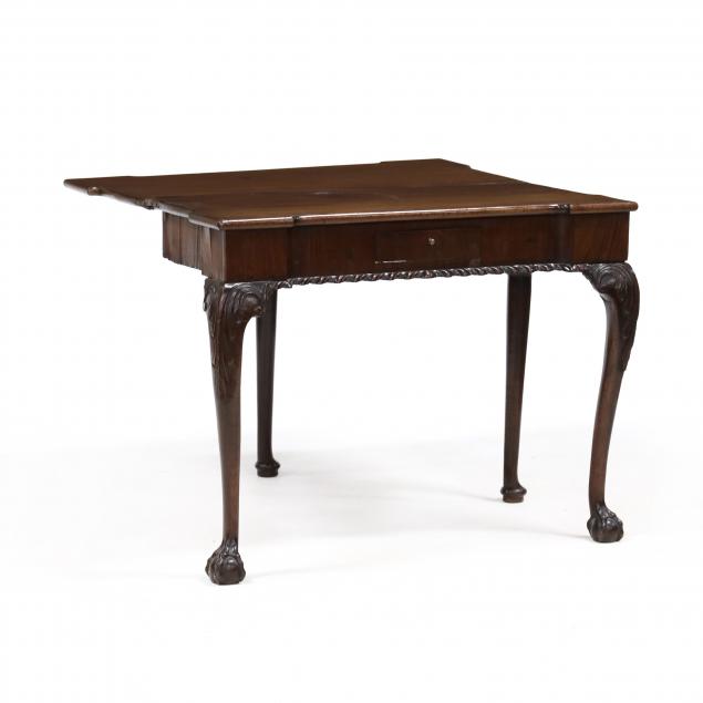 Late 18th century, mahogany veneer, pine secondary, hinged rectangular top with notched corners, gate-leg support, vertically veneered skirt with small flush drawer, applied gadrooned border, front cabriole legs with acanthus carved knee, ball and claw front feet, pad rear feet.