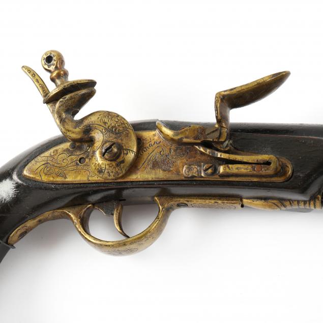 Dates unknown, all with brass works and mounts, to include: a flintlock pistol (22 in. overall length); a percussion pistol (11-3/4 in. length overall); a flintlock blunderbuss (12 in. length overall).