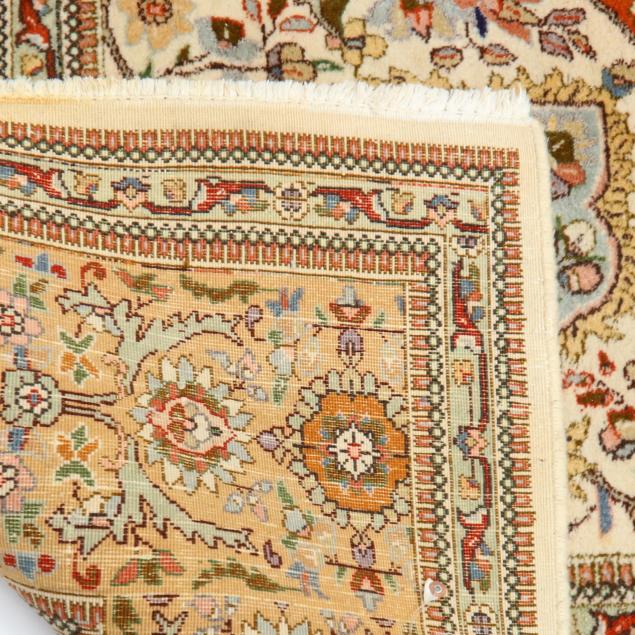 Centered with large orange oval medallion with celadon green shaped medallion on ivory field, blue floral S to corners, with light yellow border with palmette and serrated leaf motif.