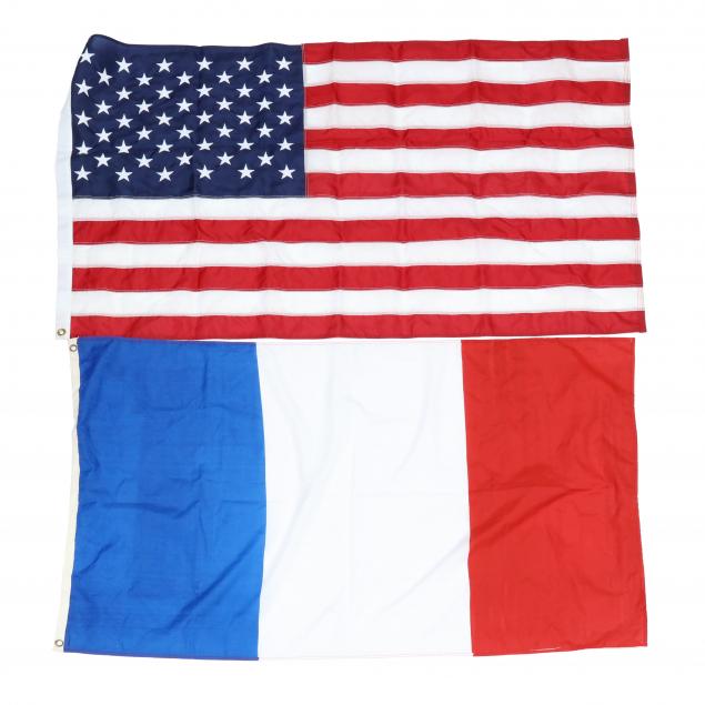 Mostly polyester, full size 3 x 5 ft., to include: two (2) Betsy Ross flags (both cotton); First Navy Jack; two (2) Guilford Courthouse flags (one cotton and one polyester - with tear); pre-1801 British Union Jack (cotton); current North Carolina state flag (cotton); U.S. flag inscribed as "Flown over U.S.S. Constitution 15 June 2009 H;" U.S. Marines; French tricolor; classic Jolly Roger (skull and crossbones); Blackbeard's flag; Royal Standard of the UK; Royal banner of Scotland; Scottish St. Andrews flag; Flag of Ireland; unknown flag with castle; four small size flags (12 x 17-1/2 in.) to include the Grand Union, British red banner, First Navy Jack, and pre-1801 Union Jack; and, finally, two unknown medieval-style banners of felt (43 in.).