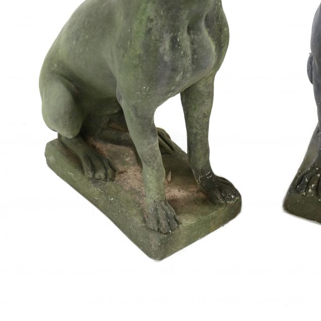 Nicely cast forms of two labradors or hounds, seated in attentive poses upon a rectangular base, appear unmarked.