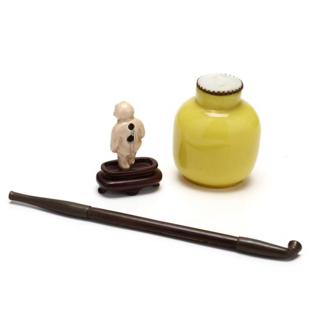 19th century, including a yellow peking glass snuff bottle with mother of pearl lid/bone spoon (3 in.), a bamboo and hammered bronze or copper pipe (8 in.), and a finely detailed white porcelain figural netsuke with peach tone glaze holding a foo lion mask with interior loose ball, on a custom wood and metal display (netsuke 2 in.)
