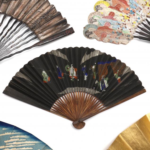 Late 19th and early 20th century examples including a multi-color (16) geisha figure fan with silvered bamboo staves, verso with hand painted flowers (8 x 15 in.); a (26) stave fan with silvered paper blade featuring a hand painted harbor scene, delicate wavy black lacquered staves with silvered decoration, verso with floral sprays (9 x 16 in.); gold leaf fan with painted scrolling blue clouds to both sides with ten bamboo staves (14 x 23 in.); signed woodcut of Mount Fuji with ten red lacquered bamboo staves, verso with speckled silver decoration (12 x 19 in.); and a small fan with black field featuring a hand painted Kabuki scene on (31) bamboo staves, verso is plain (7 x 12 in.).