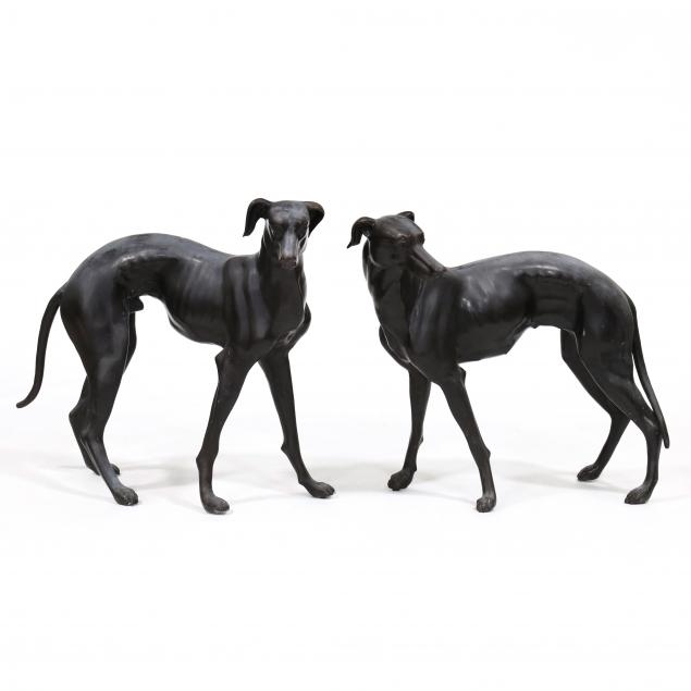 20th century, hollow cast and patinated bronze, male and female form, each standing at attention, appear unmarked.
